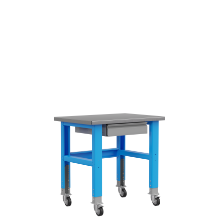 Регулируемая по высоте опора (800–1000 мм) позволяет адаптировать рабочее место под индивидуальные требования и использовать подкатные инструментальные тележки. Для удобства хранения инструментов предусмотрен подвесной ящик, а возможность выбора цвета по каталогу RAL обеспечивает интеграцию стола в любой производственный интерьер.